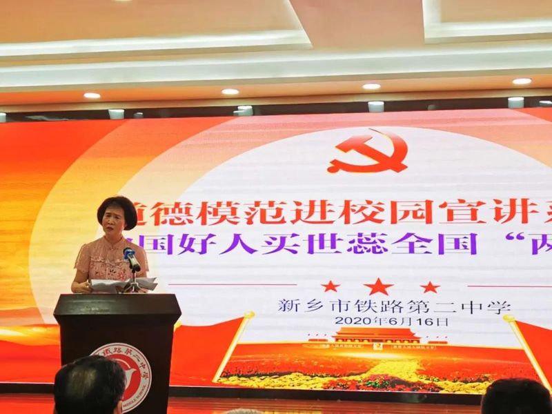 6月16日,新乡市铁路第二中学特邀第十三届全国人大代表、全国劳动模范、中国好人买世蕊女士来我校进行十三届全国人大三次会议精神宣讲,全体教职工聆听了此次宣讲。
