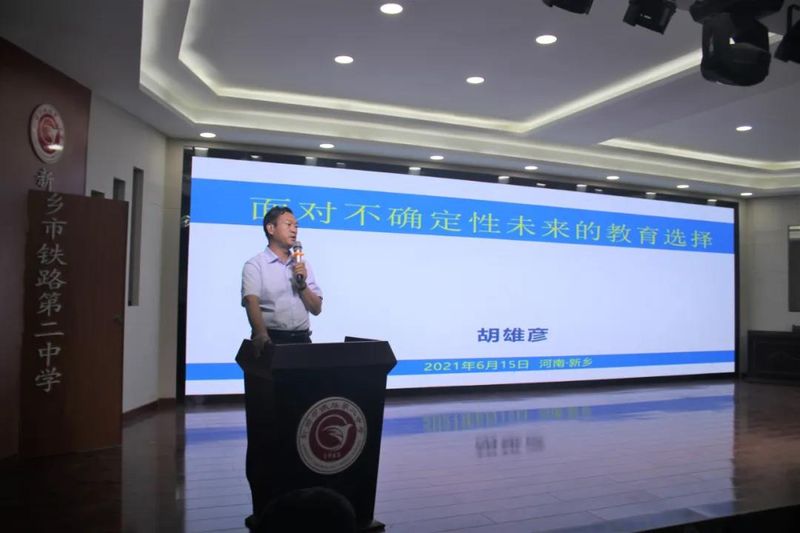 信息化是人类的第二次进化,对人类各个方面的发展也起到至关重要的作用。为了推动教师主动适应信息化、人工智能等新技术变革,积极利用智能技术加快推动人才培养模式与教学方法创新,6月15日,新乡市铁路第二中学特邀河南省政府督学、河南师范大学教育学院硕士研究生实践导师胡雄彦校长来到我校,为我校全体教师带来了一场题为《面对不确定性未来的教育选择》的专题教育讲座。