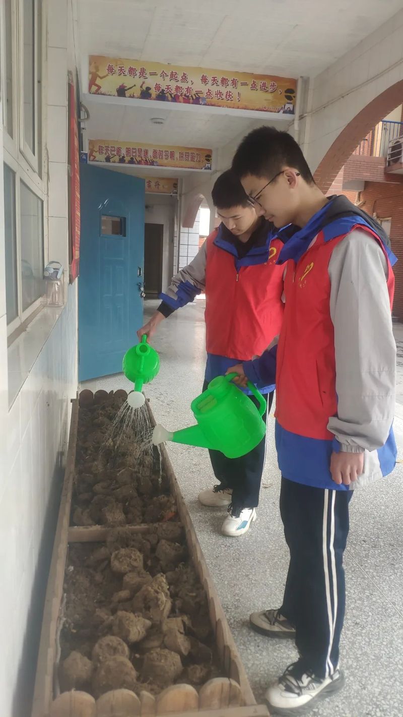结合“3.12”全民义务植树日活动,组织志愿者为我校各班门前花坛翻土、浇水、播种绿色,美化校园环境。